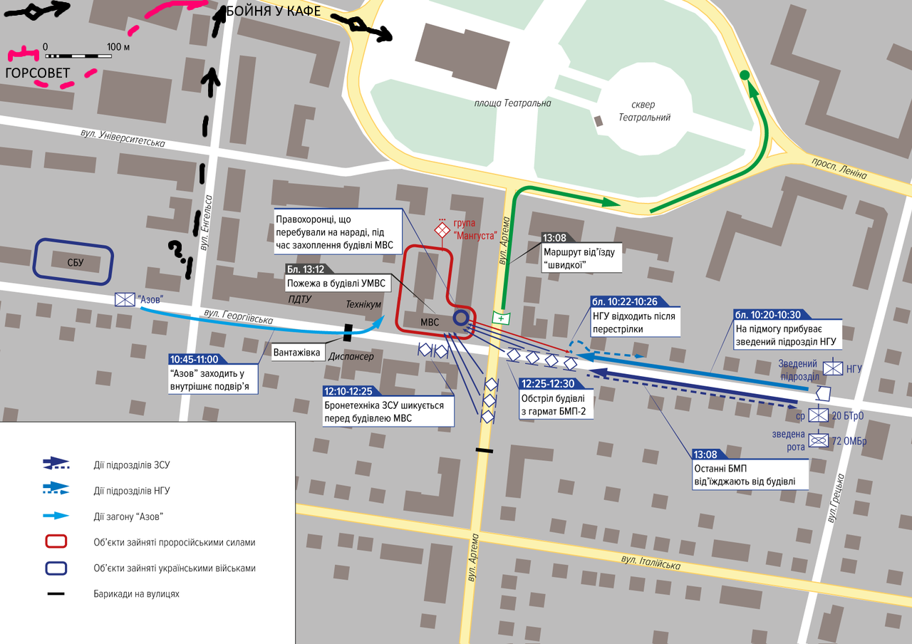Цитата (Pampa @ Вчера, 23:37) А кто убил украинских силовиков? Мы обсуждаем конкретный эпизод. Где здесь убитые силовики? Только убитые мирные. Борьба за УВД действительно подробно исследована. Различия в версиях лишь в интерпретации. Но с чего всё началось? Разве с группы Мангуста?! Ведь нет, - с приказа не допустить демонстрацию в честь Дня Победы в центр города! Это и запустило цепочку последовавших трагических событий. Одни не захотели репрессировать собственных сограждан. Другие начали в них стрелять. Группа Мангуста решила вмешаться в уже разгоревшийся в УВД конфликт. И тут же пригнали Азов, нац.гвардию и бронепехоту ВСУ. Месиво. По дороге пришлые силовики расстреливают и сжигают Горсовет, разносят баррикады, стреляют в протестующих. Эпизод из приведённого мною видео обозначил на этой карте. Только что сожжён Горсовет. По городу несётся бронетехника. Толпа протестующих отходит с площади по проспекту в сторону театра. Но на этом перекрёстке у кафе путь людям преграждают автоматчики в чёрном. Присутствует там и по полевому обмундированный боец, но это исключение. Стрелки блокируют перекрёсток, расположившись по углам зданий, а так же в сквере за кафе. Очевидно, обеспечивают проезд бронетехники. Пришли по Энгельса со стороны СБУ. На карте там обозначено расположение "Азова". Это бьётся с чёрной формой. Так что, скорее всего, это "азовцы". На видео - один раненый и двое убитых. И это за пару минут... К УВД "движуха" протестующих и видеосъёмки переместятся чуть позднее. Первая кровь мирных граждан пролилась у Горсовета, и вскоре здесь, на проспекте. Нажмите для увеличения -------------------- "После завершения этой войны у России будет самая боеспособная, обстрелянная армия в Мире" - в этом изречении важна последняя фраза, она справедлива. (Михалыч, 8.3.22)