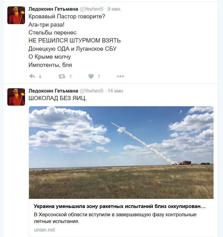 Цитата (atalex @ Дек 1 2016, 16:15) Все, сдулись хохлы. Кина не будет. https://m.lenta.ru/news/2016/12/01/rosavia_perenos/ Президент Украины Петр Порошенко заявил, что 1 декабря прошли успешные испытания украинских зенитных ракет. Об этом он сказал в ходе выступления в Киеве, передает телеканал «112 Украина». «Сегодня и завтра мы проводим запланированные учения, в том числе запуски зенитных ракет средней дальности. Никто нас не остановит, и мы будем делать все для безопасности украинского народа и государства. Только что мне доложили об успешных испытаниях сегодняшним утром», — заявил Порошенко. Учения, предполагающие ракетные стрельбы, стартовали и идут полным ходом на юге Украины. Об этом в четверг, 1 декабря, заявил начальник пресс-центра воздушного командования «Юг» украинских Воздушных сил (ВС) Владимир Крыжановский, передает телеканал «112 Украина». «Уже начались стрельбы. Все идет по плану. Никакой реакции от РФ нет. Украинские военные готовы к любому варианту развития событий», — заявил Крыжановский». Представитель ВС Украины подчеркнул также, что стрельбы проходят на расстоянии не менее 30 километров от побережья Крыма. ну, все довольны вообщем. -------------------- "А бандеровцы злятся и злобно дрочат"