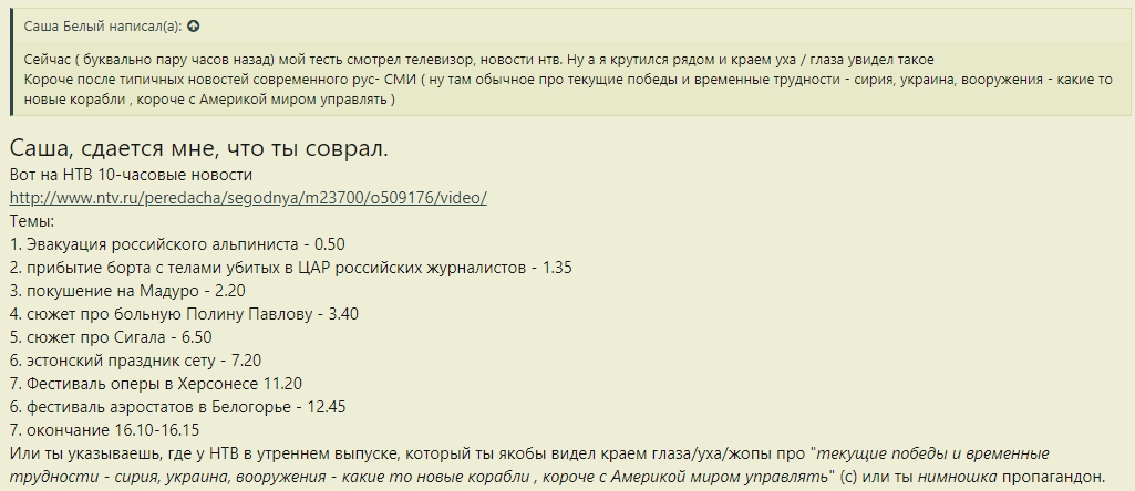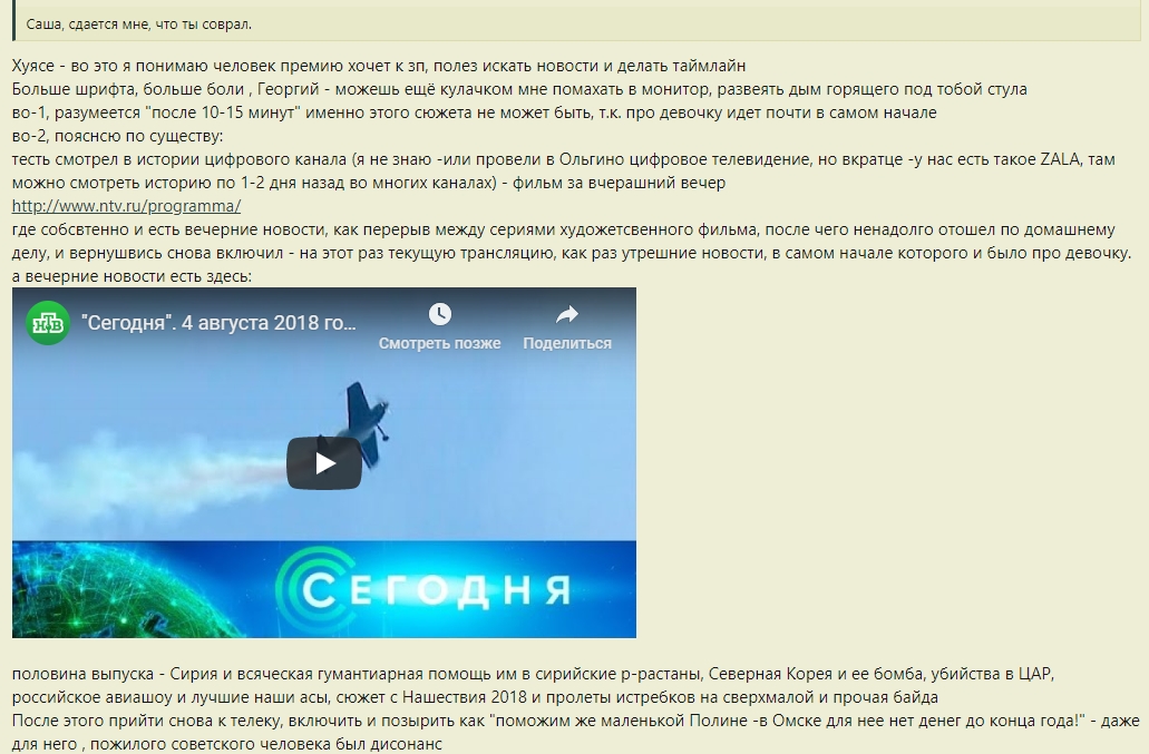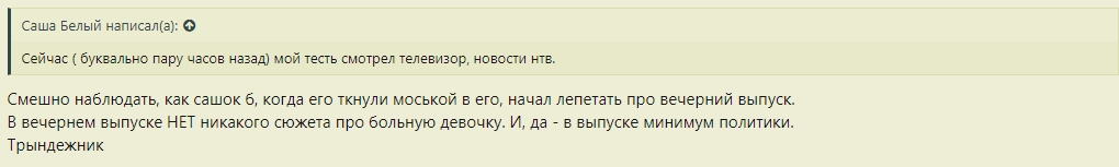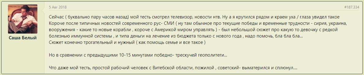 Георгий потом еще долго придуривался что не знает такой вещи -как цифровое кабельное телевидения (с возможностью перемотки, повторения ранее показанного и т.д). У него до сих пор как видишь все горит от воспминаний и скриншоты припасены. Недавно я про тестя снова рассказывал (и тоже про какую то телепрограмму) -думал или будет снова придуриваться что телепрограмма не в то время. Но Георгий не стал, ему еще с прошлого раза пячЭ . зы странно ,коверкает другие ники, и даже всовывает их в подписку -Георгий, к месту и не к месту вспоминает про водку -Георгий, скриншоты годами хранит -Георгий (заботливо подрезав свой тогдашний ник-нейм). А порвало оказывается совсем не Георгия. Вот оно как -------------------- Murem za polskim mundurem