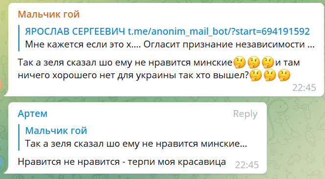 Цитата (Agapit @ Фев 22 2022, 01:18) А накуя нам территория за Донбассом? Нам бы этих поднять с колен. - Ты про ДНР и ЛНР? И всё?? Даже сухопутный проход в Крым не нужен?! Даже вода для Крыма не нужна? Приазовье - ни к чему?! Ты настоящий "юморист"... -------------------- "Верблюда можно силой привести к воде, но нельзя силой заставить верблюда напиться..."
