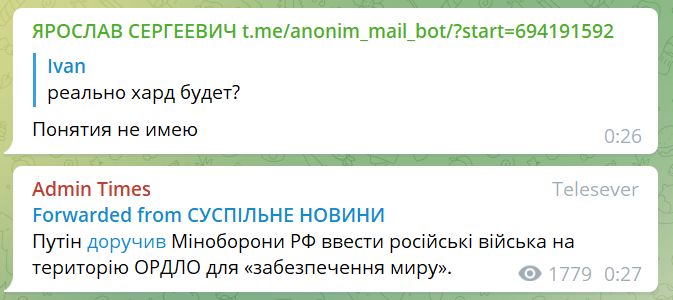 Цитата (Samars @ Фев 22 2022, 01:34) Там коридор до Крыма, возможно далее (чуть ли не до Приднестровья). Это же даёт возможность отрезать Украину от моря, лишить её значительной части хотя бы формальной промышленности. Харьков видимо не рассматривают как проблему, ибо он крайне уязвим (хотя наши мехгруппы уже мелькают там, причём именно в точках наиболее удобных для обходных ударов). Ты почитай выводы выше. Какие там "поднять с колен", ради этого царь не стал бы тащить войска с Сахалина и устраивать шоу с клоунами совбеза. Войска нужны, чтобы силы ВСУ растянуть по-максимуму. Страх, что Зе нападет не наигранный. Они знали, что дадут повод. Поход на Киев - отвлечение на негодный объект. имхо Остальное не потянем ресурсами. |
