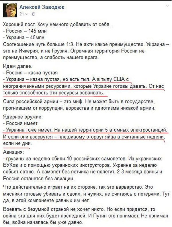 Цитата (PLTV @ Сегодня, 06:59) В дополнение к предыдущей аналитике (и в помощь ув. Саше) Любы друже, хочу спросить во-1,кто это -сия безусловно авторитетная для тебя персона,что его тексты подаются без сопроводиловки ? во-2, пока ты отвечаешь -я хочу спросить - где ну а как ваще дела ребзя ? я тут малость хохлов в пепелок сожгли на выходных 16-ю авиаполками? Лично я так понял, читая последние известия от росс-сми, что сам жестко ошибся в способностях ФСБ -рожать съедобную версию про событий в Крыму к концу недели Уже не солдат -водила возглавлял теракты ,но еще - командир разведзвода и нач-разв. в мотокопытном батальоне 56-й мобилизационной бригады третье-очередной волны резерва? больше у ГУР никого не нашлось кого закинуть в тыл ворогу в Крым на див-работу? Очень , считаю, подло со стороны этого Панова сообщать на телекамеру - в именах руководителей своих закадык по службе в разведвзводе 37 батальона в АТО..надо ему ЕЩЕ в рожу пробить,чтоб не провоцировал на хохот. собственно две полувопросительных версии: во-1, это все нажористый жЫр. В таком случае - вам как оно -съедобно жевать такую бурду с телеэкранов? запах хорошего скуренного плана не напрягает? во-2, Все так и есть. Ну типа допустим хохлы-тупые, "яка страна и теракты" получается что тупые хохлы направили 14 чел из разведзвода мотопехотного батальона в тыл врагу. Ну потому что больше некого и потому что - тупые. Этот разведзвод- одним отделением (4 чел) - у кладбища с. Суворова ,будучи застигнутым врасплох склада-схрона, жестоко отъебошил подъехавших спецназовцев ФСБ,и утёк -унося своих раненых и так далее (вернее с учетом того что их было уже не 20,как на вещали, а 4 чел -видимо и раненых и не было). два других отделения, по 5 чел, пересекли плавь по мелководью Сиваш -и вступив с воды в перестрелку - застрелили издалека,ночью , еще и десантоса. Попутно не то 8 не то 10 человек-погранцов, десантосов,фобосов ранили. отважный бандеровский мотопехотный разведвзвод поддерживал 1 БТР -который запросто плавал,нарезая км-км по Сивашу, и 1 танк -метко пуляя за 2+км с п-ова Адский,или как там его, (они были видимо из той единственной бронероты этой самой 56 бригады) чудо господне -что хохлы пусть и дерзкие и меткие,но тупые!!!! А если бы они всю бригадную роты 56 мпбр натравили на Перекоп? или не дай Боже один из корпусных разведбатов? тогда бы половину российских защитников Перекопа в рабство увели,не иначе,в таком случае. А прикиньте что будет когда ВС РФ ломанутся киевский федеральный округ освобождать и харьковскую народную республику? у хохлов ведь четыре таких парнокопытных мобилизованных бригады- дерзких и метких, в которых разведвзвод мпб запросто гойсает по пограничному перешейку и валит противников в темноте по 12 человек... А есть еще бригады 1-й очереди и 2-й очереди резерва Вы как люди умные,а ни разу не тупые хахлы, должны понимать что будет в таком случае с освободителями-ихтамнетами ХНР (которые все же не такие крутые как ЦНС ФСБ) при встрече с 57,58 и так далее парнокопытных бригад биндер ? -------------------- Murem za polskim mundurem