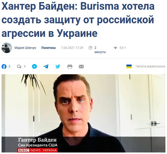 PS какой простор и пример для отечественных ответственных журналистов ! Так и вижу слоган "Если дочери Путина не войдут в совет директоров Роснефти это сделают солдаты НАТО" ![]() В интервью BBC News Украина он заявил, что не считает ошибкой свое решение войти в Совет директоров украинской газодобывающей компании Burisma, а даже наоборот – ведь это позволило создать защиту от российской агрессии "В то время [2014 год] русские вторглись и аннексировали Крым. Российские силы нарушали восточные границы Украины и стремились к контролю над природными ресурсами и трубопроводом. А Burisma хотела создать защиту от российской агрессии. Они [компания] осознавали, что должны выйти на международный уровень, чтобы диверсифицироваться и защититься от российских посягательств. А еще фамилия Байден – синоним прозрачности и демократичности. Вот почему я сказал, что моя фамилия была на вес золота. Но моя роль в совете директоров ограничивалась корпоративным упорядочением и прозрачностью", – отмечает Хантер Байден. -------------------- Красный цвет - цвет администрации. © Pampa