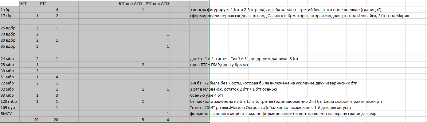 Это все без учета ВВ\НГ (нацгадов,которые на самом деле в абсолютном большинстве - были переименновыее ВВ). Но про их участие в линейных боях мне мало что известно 1) Случай в Лисичье и южнее (между речкой и Лисичье) -ВВ из под Херсона 2) Два вновь сфомированных батальона нацгадов у Славянска, но к августу они были на отдыхе. 3) И спецназеры из 1 tier НГ охраняли аэродромы (тот самй Асавелю-АССА, который был известен с Майдана -был в Крамоторске например, причем с самого начала -крамоторск же был не авиабааза всмаделшиняя,а авиакомендатура -гноильня. Советский авиаполк,прчием на каких то корчах типа Су-15 кажется, был еще в 90е кокнут) Почему их использовали меньше? во-1, ВВ НГ были аналогом СМЧМ а не оперчастей СССР/РФ. Их и использваоли в основном в тылу, т.к. их основная мощща была в палках и щитах У Лисичье они оказлись в основном потому что некому было заткнуть прореху в общем бовом поярдке (изза причудливых петлей и изигбов, т.к. ВСУ нсачла думали что ттут типа контрпаризанско-дивизерсонная война, а оказалось -общевойсковая) - они был растянутый и длинный фронт.Может в тыловой зоне были там сям бок посты,но про них мало что известно во-2, они были очевидно демрализованы и ненадежны после Майдана ( были напротив в цепях) и переставлении улады. Кстати у ВСУ эти БТГ и РТГ не имели постоянно состава и распрделения, т.к. комнадование постоянно перемешивало войска (когда я писал про такое про Сирию,мне аж пряом ФЕЕЕ летелао ) -что бываетп сотяонно при неудачномс течении обстяотелсьвт и быстром развитии событий. Плюс возможно в их штабных бумагах и в умах -не было никакой разницы, и на карте значко выглядел такой же - или сводная только что БТГ или слаженный усиленный батальон. Нажмите для увеличения -------------------- Murem za polskim mundurem