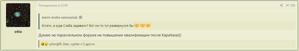 Цитата (Arqus @ Сегодня, 14:52) Кредит давали до госпереворота. Но Саша этого конечно не помнит Так ты уж уточни - или фашисты или братский народ, т.к. видос Георгия - это вообще осень 2013 года, или госпереворотом определяется или как. В какой день стали фашистами, и в какой именно период суток этого дня. Или просто на кого рус-сми назвали тот для россиян сходу и фашист и пох на все что было даже неделю назад (наколупать всякого найдется, я например и про РБ так уже несколько лет указываю, в рус-ми найдут...но то такое.. ) И почему из территорри с несколько десятками млн. населения фашистов хотели сделать Новороссию? Или Новороссию надо было очистить от этих десятков млн. населения фашистов самыми передовыми антифашистскими методами, разработанными в лучших анналах российских здравниц? Вопрос требует дальнейшей проработки и привлечения лучших специалистов по русофобии. -------------------- Murem za polskim mundurem