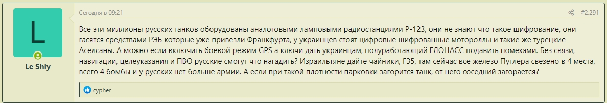 Цитата (Retwizan @ Сегодня, 12:38) Вот так и хочется, чтоб Зеленский отдал приказ на наступление, чтобы глянуть, как этих самых пiтрiотiв ВСН и ВС РФ перемалывают в фарш. Не перемолют,аналогвые армии ВСН и РФ катострофически устарели. Я не говорю что у ВСУ армия шедевр. Но куча учений с натовцами и доступ к современным высокотехнологичным системам дает огромное преимущество. Доходит до смешного, российские военные под покровом ночи таскают что-то в Украину, не у а чо, темно никто не видит) Однако над ними висит беспилотник и все снимает https://twitter.com/GirkinGirkin/status/102...5335053312?s=20 Не они конечно не дураки и чтобы такого не было прикрывают небо ЗРК, в результате беспиолотник снимакет ЗРК на боевом дежурстве https://twitter.com/GirkinGirkin/status/105...2166209537?s=20 С таким отставанием как ты собрался воевать? Искандеры сильно помогли армянам? -------------------- "Да чо там? Расследование, понятное дело, не сможет юридически достоверно установить принадлежность ЗРК, сбившего Боинг. А разные косвенные доки и всякие снимочки с интернета юридически ничтожны. На них заключение не построишь. Тут, кстати, тактика наших властей - вкидывать вагон вбросов, достаточно действена. Глядишь, за кучей фейков правдивая информация потеряется."
