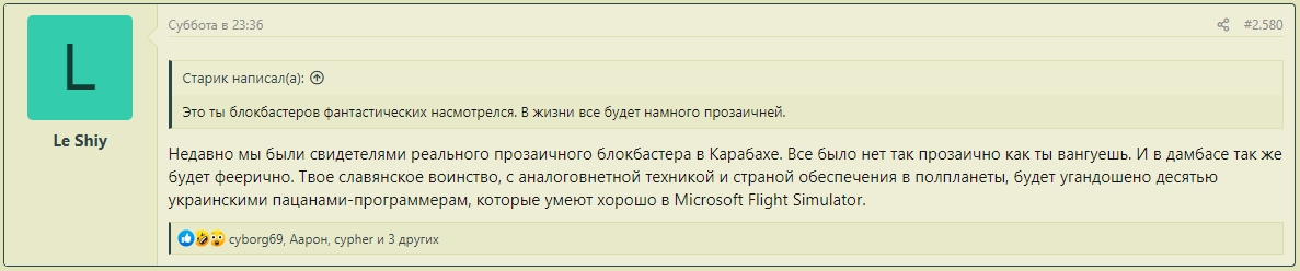 Цитата (12th @ Апр 14 2021, 17:05) Кстати мне тут в инсте написали что некий крупный военноначальник ВСУ с ником Арти Грин расписал все тайны Вселенной и между делом рассказал как будет проходить война Украины с РФ. Говорят что бомба просто. Твиттер и фейсбук трут репосты и блокируют пользователей. Может кто то скопировал? Хотелось бы ознакомиться. Да успокойся уже. Вполне реальный сценарий блицкрига. Тем паче у ВСУ что ПВО, что ВВС с гулькин хрен. С пол хрена. |