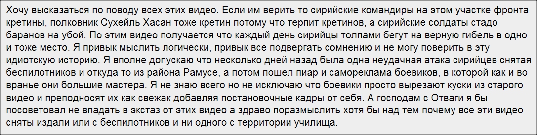 Цитата (Samars @ Сегодня, 05:54) Я не понял о чём ты. Подождём какой-то другой Сирии? Даже трупы так и не отдали, где они хотят Ад и Израиль с этим нарядом сил устраивать? Всё что они могут это РБК куда-то плюс-минус валенок кидать, вот и весь Израиль. Причём тут трупы и юг Алеппо? Стереть пару кварталов много способностей ума не нужно. Даже этого не пытаются. Шо, бедняги, попасть не могут? Ты сам-то в этой веришь? Цитата (Samars @ Сегодня, 05:54) Это что то совсем травяное, ИМХО. ВКС там (у Алеппо) работают буквально с 31 числа, вот только без толку, как обычно. Вот те же селфи с РБК что делали бойки вовсе не в мытищах снимали, а ЕМНИП чуть юго-западнее Рамусеха. А вот давайте все вместе и посчитаем, сколько было работы ВКС в районе прорыва. Я вот буквально могу по пальцам пересчитать то, что помню я. А ты сколько насчитаешь? |
