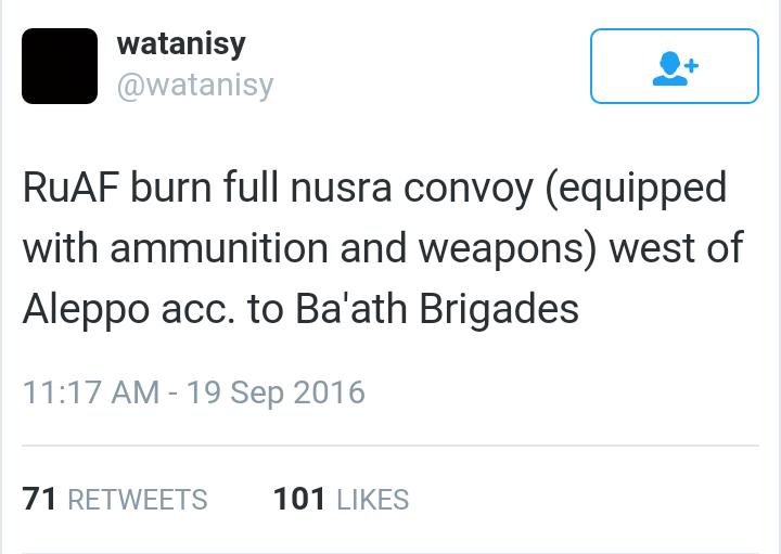 Цитата (fahed @ Сен 20 2016, 09:35) Все равно - неужели сирийцы или ВКС такие дебилы, что не знают, где находятся склады Красного Полумесяца?? Более того - их еще и беспилотник вел (это про вчерашние скрины из видеотрансляции МО). Взято с лостармора: https://twitter.com/tobiaschneider/status/7...src=twsrc%5Etfw Видно, что едут из Алеппо |