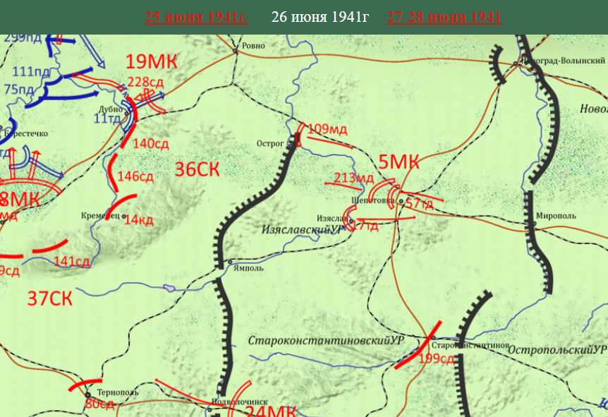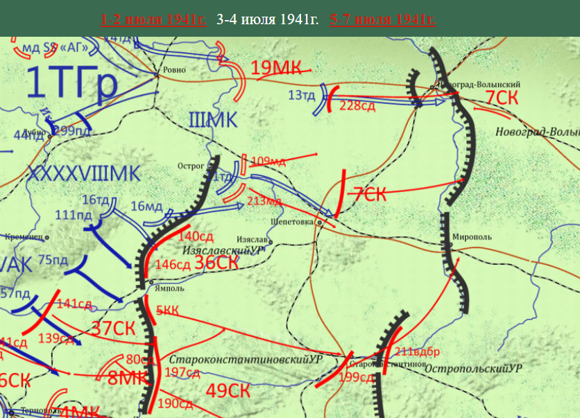 Получив приказ 21.15 3 июля - выдвинуться в район Мирополя, и занять оборону Жаборица - Мирополь- Коростки, без учета извиво реки -35 км. к утру 5 июля, ей надо было пройти, по оперативной карте (т.е. по прямой) - от прежнего левого фланга к новому левому флангу - 67 км, от правого к прафому - 35 км https://pamyat-naroda.ru/documents/view/?id...:spravki:drugie Следует отметить что вте годы оперативный (по прямой по карте) переход пеши маршем считался 20-25 км, маршрутный (непосредственно по дороге) 32-40км - такое различие вызвано тем что не каждый пункт А и пункт Б соединен напрямую дорогою, требвалс делать марши в сторону, проходить по бездорожью, стоять в пробках на перкрестках и мостах рпопуская одна часть - другую. При это по очертанию нового положения требовалось выполнить захождение справа налево, перестроив фронт распрделения частей вместо "на север" - "на запад." Т.е. к тому же распрделеяя свои маршруты захождением слева направо. Это привело к тому что к утру 5 июля в обшем районе ного расположения был только авагнард одного из полков, 492 сп, самого ближнего , которому было назначено идти далее всего насевер. Авангарды остальных полков прибывали только 5 июля вечером. Чуда не приозоишло - пехотный марш куда как медлнее чем летает карандашик по карте в высшем штабе, и печатется грозный в решительном духе приказ. То что бойцов не кормили и прочее блаблбла что писали особисты в своем донесении совершенно не к месту,разумеется. Или приказ в решительном духе за день совершить сверхфорированный марш ( по приказанию на 35-67 км -на 15.-3 перехода) или организовать преим пищи,отдых и плановые привалы по Уставу. Тем верменем уже днем 5 июля здесь были авангарды подвижной 11 тд немцев. Которые разумется более медленные советские анагрды отогнали минометно-артилеорийским огнем из глубины, что вместе с бомбежкою сорвало планомерное занятие позиций. То что здесь раполагалсся так же и Новград-Волынский УР -немцев не сдержала т.к. он был в значительной степени демонтирован. Занятую наспех этими авнагрдными батальонами. чревзычайно широкую и для полной дивизии, полосу немцы разумеется быстро перодолели, нащупав разрывы и сходу продолжили насутпление массивным удаом - 11 тд на запад, а 16 мд прикрывала ее левый фланг уступом - как раз по растянутой маршевой колонне остальных сил 199 сд, что двигалась с юга -на марше был застигнут и размчикан 500 артполк, удару , разгрому и рассению подвегрлись тылы и техподразделения, пехота занимала боевой порядко на марше посреди поля и дороги и так же была отброшена. Будучи затигнутой на марше, да еще и пойманная врагом с фланга - 199 сд ,под давлением двух усиленных подвижных дивизий (1 тд и 15 мд) -- была разгромлена и отброшена, будучи разрещанной на вде части -частично на север,частично к югу. Разгромленные, с марша, части будучи обьяты паникой и бросив на поле боя масчасть - были выведены глубоко в тыл, и приводились в порядок в районе Богуслав-Тараща. Тот же 492 сп (который был в районе ного расположения первее всего,но которому надо было идти далее всего на север, и его значительная часть оказалсь в результате к северу. в лесном арйоне,от Мирополя) - отходил и воевал уже вместе с 7ск Ситуация конечно весьма печальная (и для рассмотрения 1941 не новая) - тут переплелись и обьективные факторы (немцы то не слали копией своей приказы в наш штаб) и просчеты (как в организации танковых в