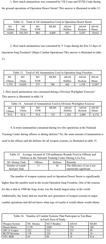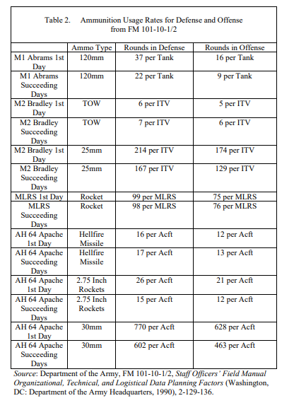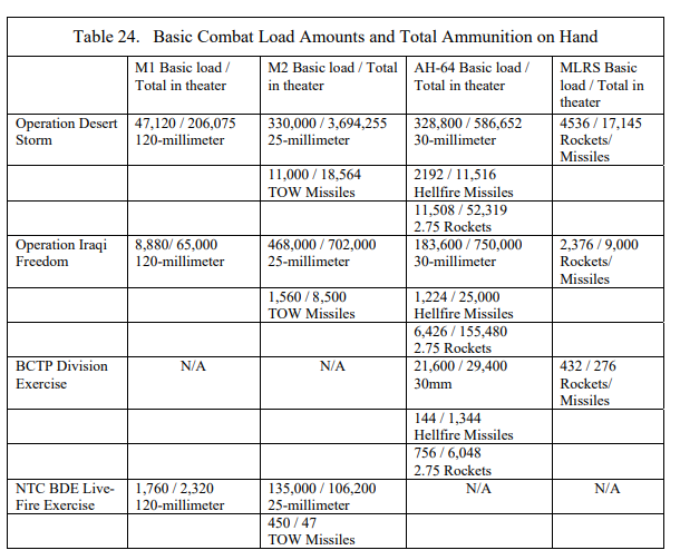 Посвящена расчетным и фактическим (Ирак-91,Ирак-03) использованиям б\бк в армии США (бем USMC) по 4 основным позиция -бк Абрамс/снаряды, бк Брэдли - Тоу и 25-мм снаряды, MLRS реактивные снаряды,без ATACAMS, и Апачи -Хелфайеры, нурс Гидра и 30-мм снаряды) https://apps.dtic.mil/sti/pdfs/ADA451782.pdf Приводятся данные затрат бкбк во время учений дивизии, бригады, национального центра Приводятся данные по наличию бкбк во время кампаний - более 20 таблиц Для иллюстрации * Табл 24 ,войсковая загрузка и всего на ТВД (для учений перепутано местами ,видимо) бкбк * Табл 2 - расчетный расход бкбк на день боя по тому или иному элементу технику (на MLRS 8 залпов в день, мое почтение) * Табл 12,13,14,15 фактический расход Ирак 91,03, и расход учений, Табл 16 - подсчитываемое числео единиц (когда вычисляют на штуку) Прим - указан расход 6,604 MLRS, при том что более 4900 было потрачено 7 корпусом в этапе артилерйиской подготовки и контрбатарйеного подавления перед основным насутплением (ака Artillery Raids) противостоящих иракских дивизий (по книге Jayhawcks) -тяжелые потери понесли 9по амр.данным) 22 батальона артилерии -фактически полностью артилерия 4-5 иракских дивизий (они были небольшие),наряд сил был приличный (помимо MLRS использовалась артилерия - 14.5 тыс снарядов, а так же удары вертолетов, помимо артпозиций выцеливали так же узлы связи и кп возле них, собсвтенно полевые позиции пехоты не были целью на данном этапе. в соотв. KILL-BOX так же работала и USAF - to prevent ememy logistic и нанося общее поражение, т.к. Б-52 конечно свободно падающими бобмами,например, особо выцеливать не могли) даже с учетом советских норм ПСИУО - как можно пркинуть - обеспечивалось 2-3 кратная норма по графе "подавить" Нажмите для увеличения -------------------- Murem za polskim mundurem