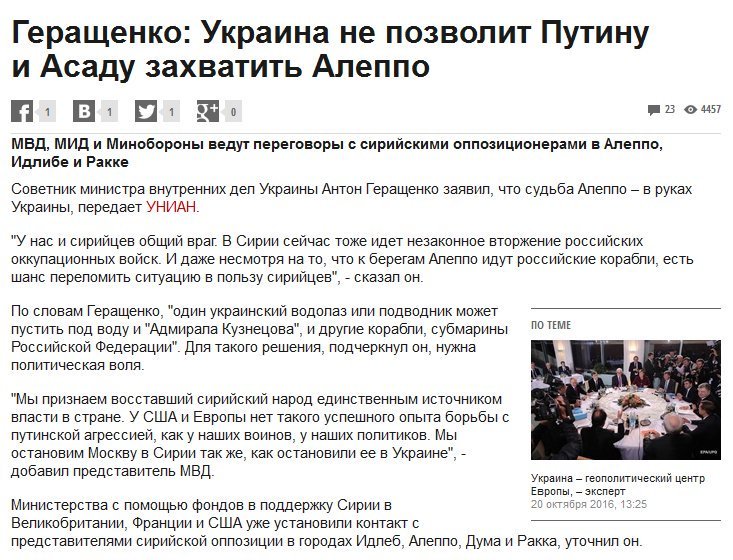 Цитата (pilotv @ Сегодня, 10:57) Сука мы самые мирные в мире миротворцы и самые гуманные гуманитарии. По поручению президента Владимира Путина 4 ноября в Алеппо будет объявлена гуманитарная пауза. Минобороны призвало боевиков выйти из города с оружием по двум открытым коридорам. Для мирных жителей открыты шесть коридоров Министерство обороны России заявило, что все попытки прорыва боевиков в городе Алеппо не увенчались успехом, они понесли большие потери и возможности вырваться из города у них нет. «Во избежание бессмысленных жертв Министром обороны Российской Федерации генералом армии С.К.Шойгу по поручению Верховного Главнокомандующего Вооруженными Сила ми Российской Федерации В.В.Путина принято решение ввести в Алеппо 4 ноября с 9 часов утра до 19 часов вечера «гуманитарную паузу», — говорится в сообщении Минобороны, поступившем в РБК. Подробнее на РБК: Ну с поляками то проконало в 612м, думают что дата волшебная и бабахи тож сами вылезут) ну могут конечно быть и другие версии. но они уже больше к фантастике относяться) |