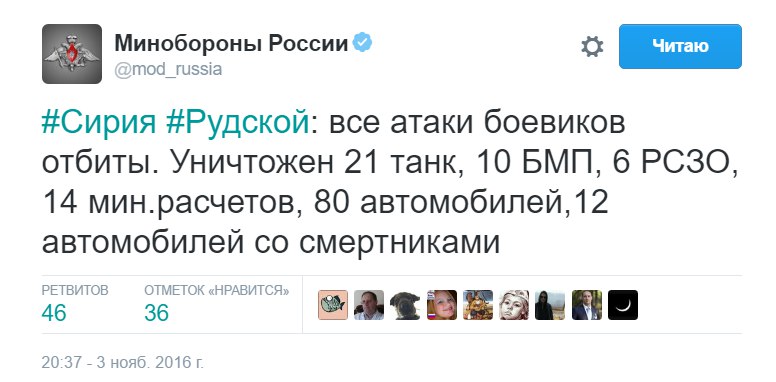 Цитата (Zaeb Alli @ Ноя 3 2016, 14:23) АТАКИ БОЕВИКОВ В АЛЕППО ОТБИТЫ, ТЕРРОРИСТЫ ПОНЕСЛИ ЗНАЧИТЕЛЬНЫЕ ПОТЕРИ, В Т.Ч. 21 ТАНК, 10 БМП, 14 МИНОМЕТОВ, 80 АВТОМОБИЛЕЙ С ПУЛЕМЕТАМИ – РУДСКОЙ Во так уже переобулся!Забыл 6 РСЗО добавить и 12 смертников Нажмите для увеличения -------------------- Мнение — это как дыра в заднице — есть у всех. Но «есть у всех» не означает «надо всем показывать»