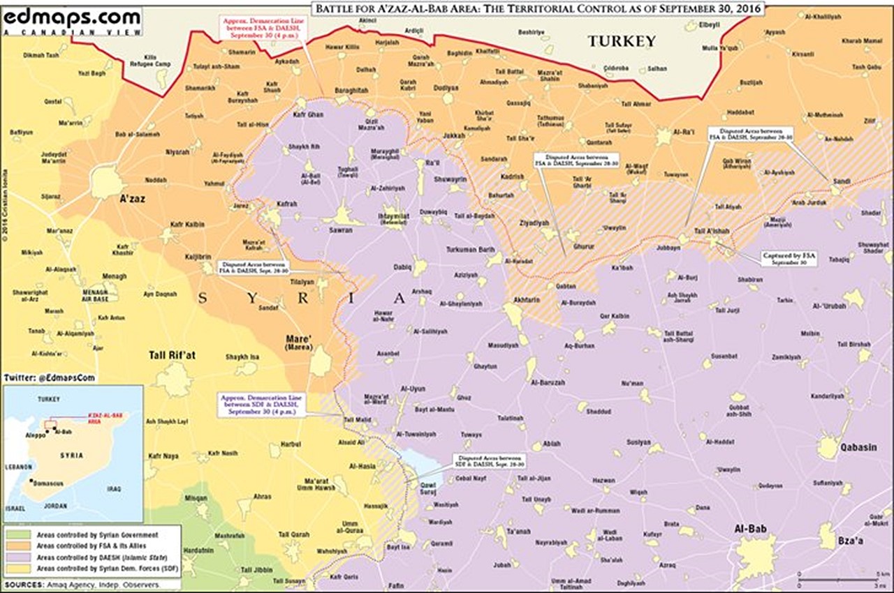 #Syria North #Aleppo #Azaz #map from Al-Ra'i to Al-Bab via #Jubayn #TallAishah Sept. 30 #FSA #ISIS #euphrates_shield
