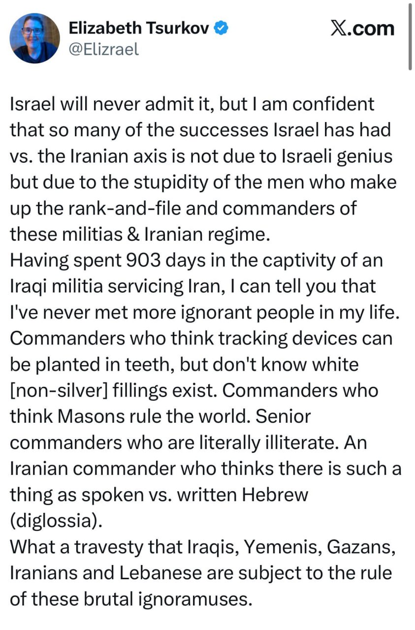 Цитата (fahed @ Сен 10 2025, 08:12) ВОУ!!! BREAKING: In 2023, Russian-Israeli Princeton researcher Elizabeth Tsurkov was kidnapped by Kata'ib Hezbollah.<br><br>Today, American President Donald Trump has announced that she has been released, thanks to his efforts to free her. pic.twitter.com/hOuIoTxItP— Hen Mazzig (@HenMazzig) September 9, 2025 В заложниках даже похорошела, прости Господи After 903 days in captivity, Princeton student Elizabeth Tsurkov has just been released by Kata’ib Hezbollah and is now safely in the hands of the American embassy in Iraq.<br><br>The Congressman met with Elizabeth’s siblings this past March. He knows how hard they fought for the safe… pic.twitter.com/4AkqxzU8QA— Office of Congressman Abe Hamadeh (@RepAbeHamadeh) September 9, 2025 Это не она на фото |