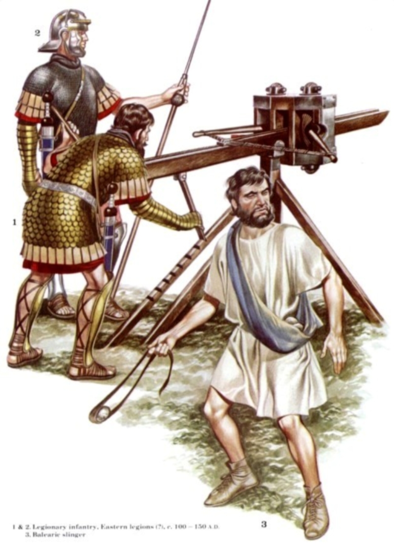 неподвижный более ранний,но после выстрела его долго раскачивает,подвижный же быстро гасит раскачку. малый требушет,метал камни в 15-20кг. большой требушет,снаряд в 200 фунтов,это примерно 90кг. небольшой онагр,такими пользовались римляне,метает камни в 5кг. двухторсионная баллиста,стреломет. большая праща,преимущество скорострельность,недостаток малый вес снаряда |
