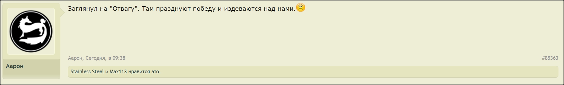 Цитата (Retwizan @ Ноя 28 2016, 12:08) Это который канадский кастрюлеголовый? Помню, как мы с ним схлестнулись в российской теме. Бан, естественно, был не избежен. faxedушка прости за оффтоп. У меня ящитаю эпичней. Он с компашкой спорил с одним пользователем, этот пользователь написал: "Я понимаю, у меня айпи не тот". Я лайкнул этот пост. Верник пишет: "У тебя и лайкнувшего это simuila не айпи не тот, а кое-что другое. Объяснить или остановимся?". Я пишу: "Давайте"(из контекста - "объяснить", ту обрезал цитату). После этого он меня блочит насовсем со словами "залётный гастролёр" что означают эти слова, где нарушение правил не понятно от слова совсем. |