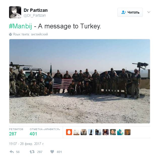 Цитата (fahed @ Мар 2 2017, 16:25) Проребельский СОХР подтверждает - СДФ контратаковали и отбили захваченные вчера туркоребелами деревни. Потери ребелов - 6 убитых и 1 убитый у СДФ. СДФ утверждает, что убито 12 бойцов противника, (часть пруфнута на видео), взято 2 пленных + захвачена ACV (пруфнут) и несколько единиц техники уничтожено. http://www.syriahr.com/en/?p=61992 А какие грозные турки были 2 дня назад.. Вот такой флажок в покруче будет. Нажмите для увеличения |