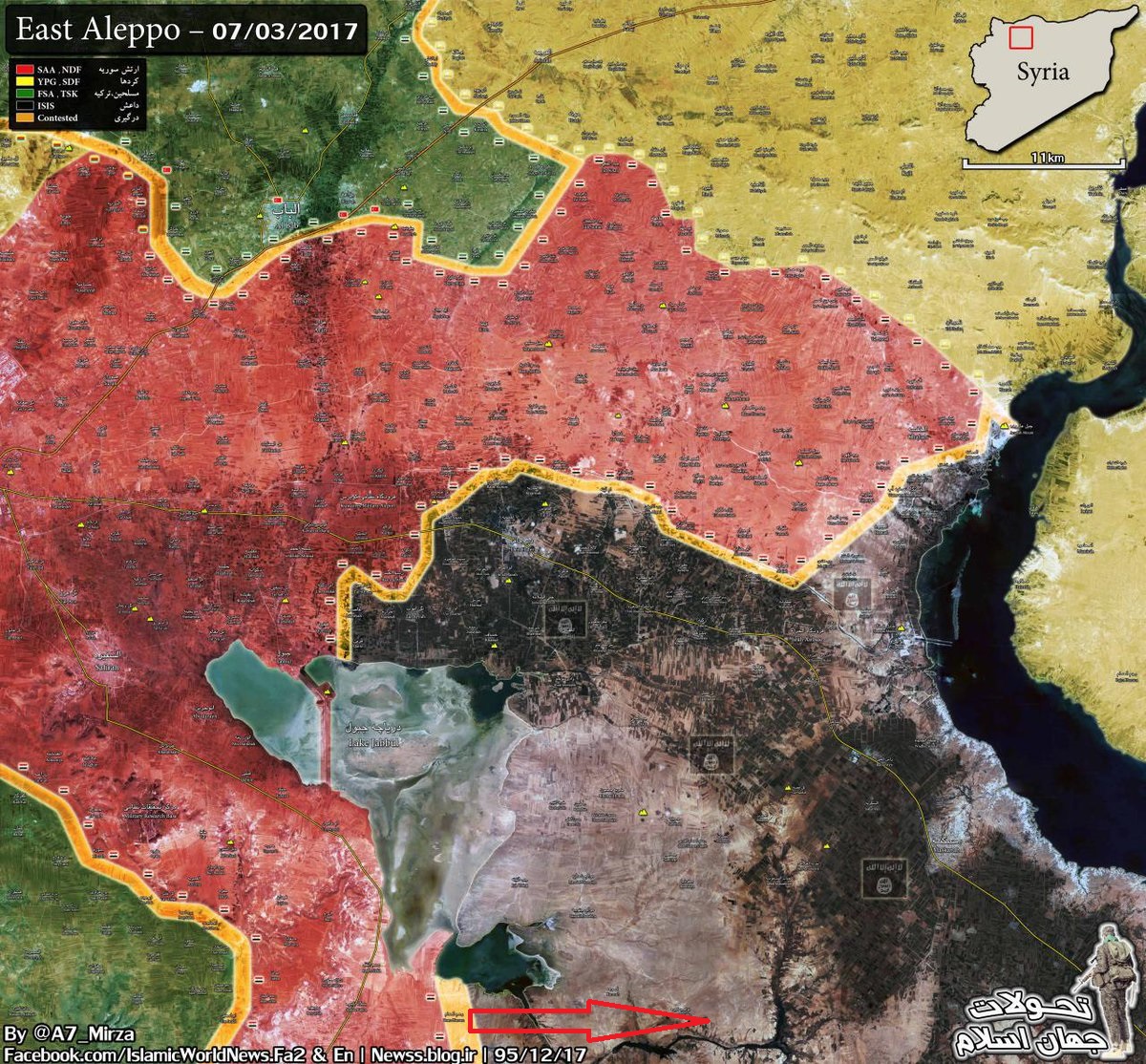 Цитата (soldier_of_fortune @ Мар 8 2017, 11:04) Наши советники,растут не поням а ..... Такую операцию замутить,а если удастся? NDF Prepare to South Aleppo Offensive. Для этого надо, чтобы иранцы и сирийцы хорошенько усилили группировку к югу от озера, так как в районе Ханасера и далее силы "Фатимиюн" и НДФ размазаны по блокпостам вдоль дороги и их недостаточно для наступления. Разве что оборона черных совсем рушиться будет. |