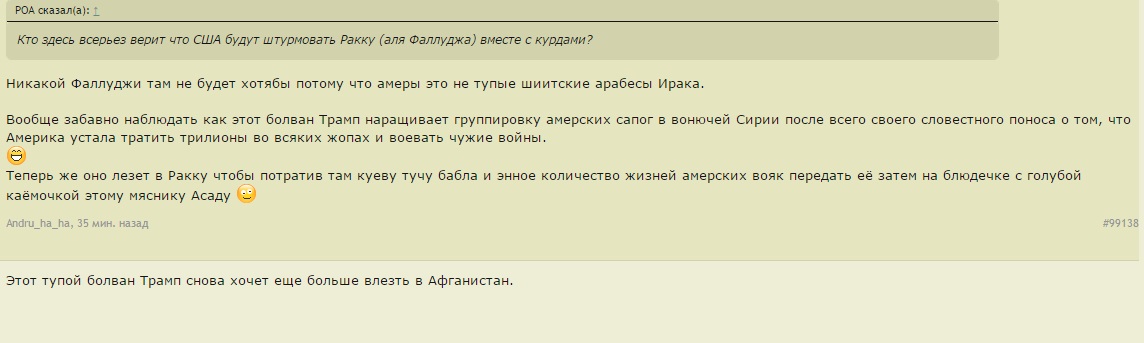 Цитата (Серый волк @ Сегодня, 21:40) Ракка на первом видео 1:00 - бородавочник + 100 к морали -------------------- #AbuHajaarDidNothingWrong