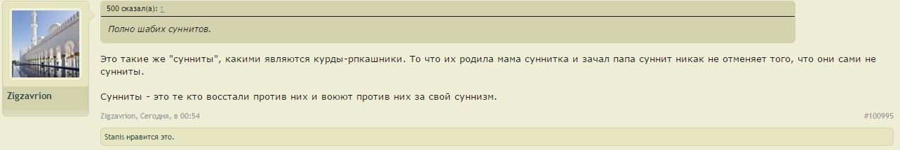 Цитата (oleg27 @ Мар 22 2017, 22:37) Ну так пускай упорнее защищаются в чем проблема то? Алавиты как раз меньше всех встают на тапки. Ты сделал мой день! Алавиты меньше всех встают на тапки!?!? Да блин скок раз аль Кудсы залетали, как и Нуджаба - их тупо вырезали десятками на позициях, что говорит не только о том, что они тупые воены, но и о том, что они не бросили позиции - или переговоры хезов в цементке и рамусехе при деблокаде уже забылись(про трусливых асадышей, бегущих под юбку женам). В то время как алавиты встают чуть что на тапки(только если это не местные алавиты, защищающие свое село). |