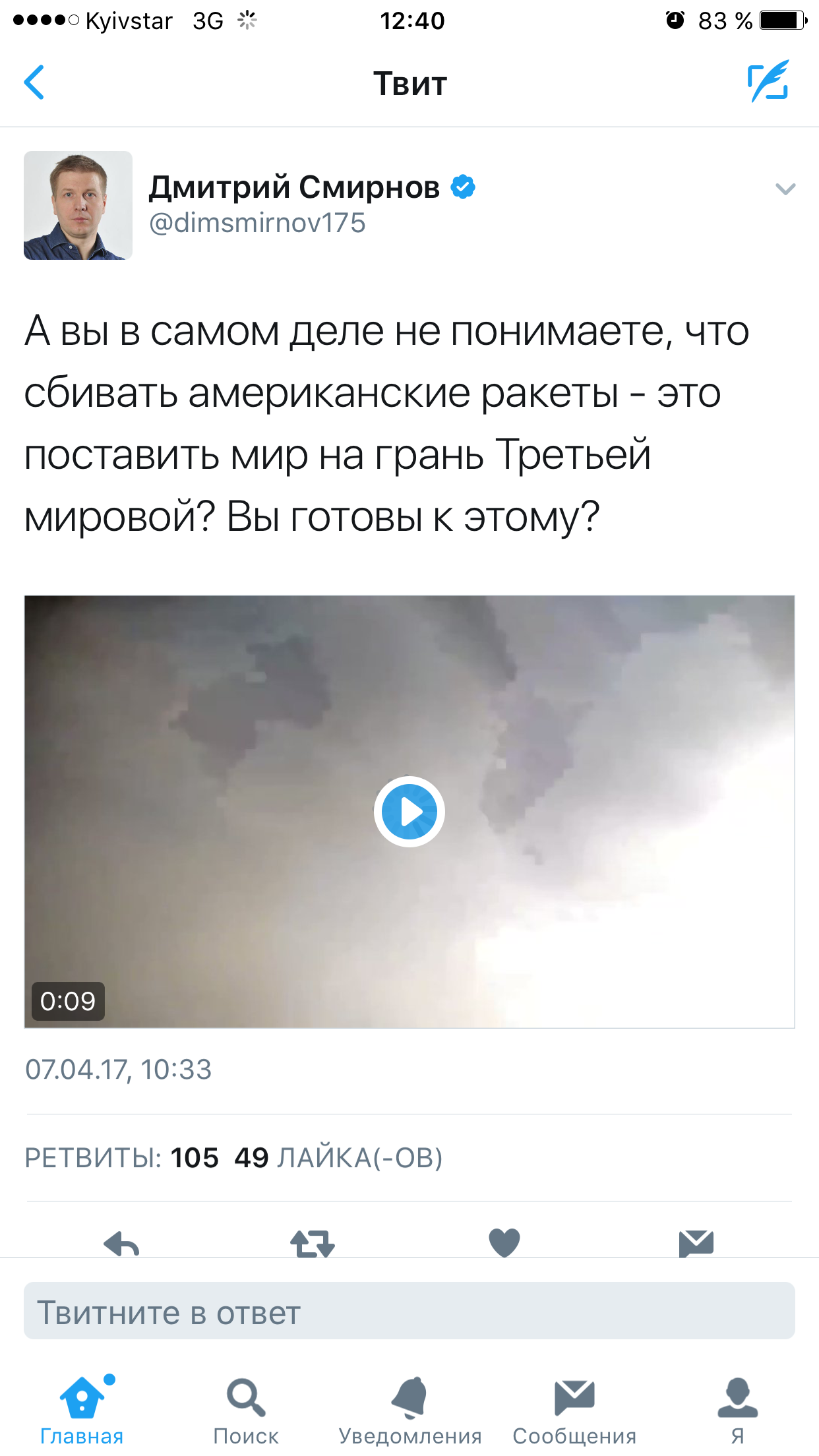 Цитата (Retwizan @ Апр 7 2017, 12:35) Сбивать американские ракеты - это, действительно, серьезный конфликт. Однако никак не грань 3МВ. Ни один американский объект или гражданин не страдает. Ну а то, что сбиваем потенциально опасные объекты, которых не должно быть в небе Сирии - это, как бЭ мы в своем праве. Цель США,была именно продемонстрировать серьёзность своих намерений и проверить серьёзность намерений РФ. По результатам или будет новый раунд дипломатии или начнут долбать уже всерьёз. Вот в чём вопрос.Сейчас "шар "на стороне РФ,как отреагируют так и будут развиваться дальнейшие события в Сирии. И,не как по другому. Syria frontlines Killed by #USA in #Shairat + RIP -------------------- "Нужно прощать своих врагов, но не прежде, чем они будут повешены." - Генрих Гейне.