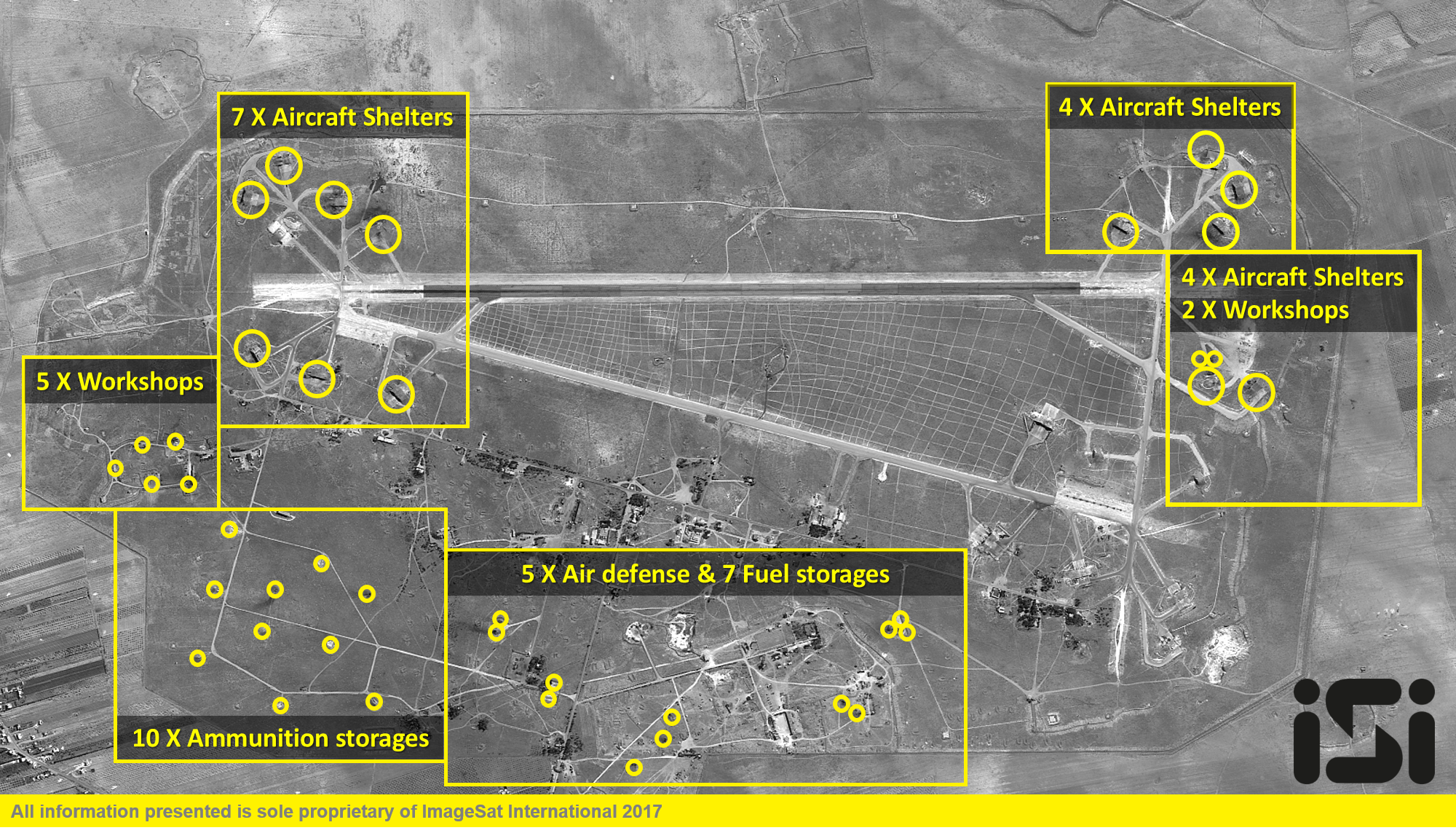 Глава провинции Хомс и агентство САНА обвинили Соединенные Штаты Америки в ракетном ударе по селению Шайрат, расположенному вблизи авиационной базы: в результате падения 2-х ракет Tomahawk здесь погибли 5 человек, включая 3-х детей, также были разрушены жилые дома.
