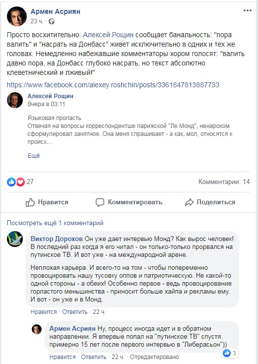 Цитата (fahed @ Дек 27 2019, 11:53) Ты дислексик? Речь не о человеке, а о местах где они работают и откуда ты это таскаешь. Статья в Ле Монд с этим его конкретным мнением, столь развернутым в личном аккаунте ФБ, я не видел - и уверен на 101% что ты тоже. То есть Рощин пиздит? Да, в его ФБ нет ссылок, но это не отменяет того факта, что статью Ле Монд все таки напечатает. Это сообщение отредактировал Arqus - Дек 27 2019, 13:32 Нажмите для увеличения -------------------- Вы нагло стяжали огромный запас знаний, и тенденциозно его используете в свою личную пользу. Я чую что я прав, но не знаю как это обосновать против такого исторического и интеллектуального чудовища как вы, и это меня злит!