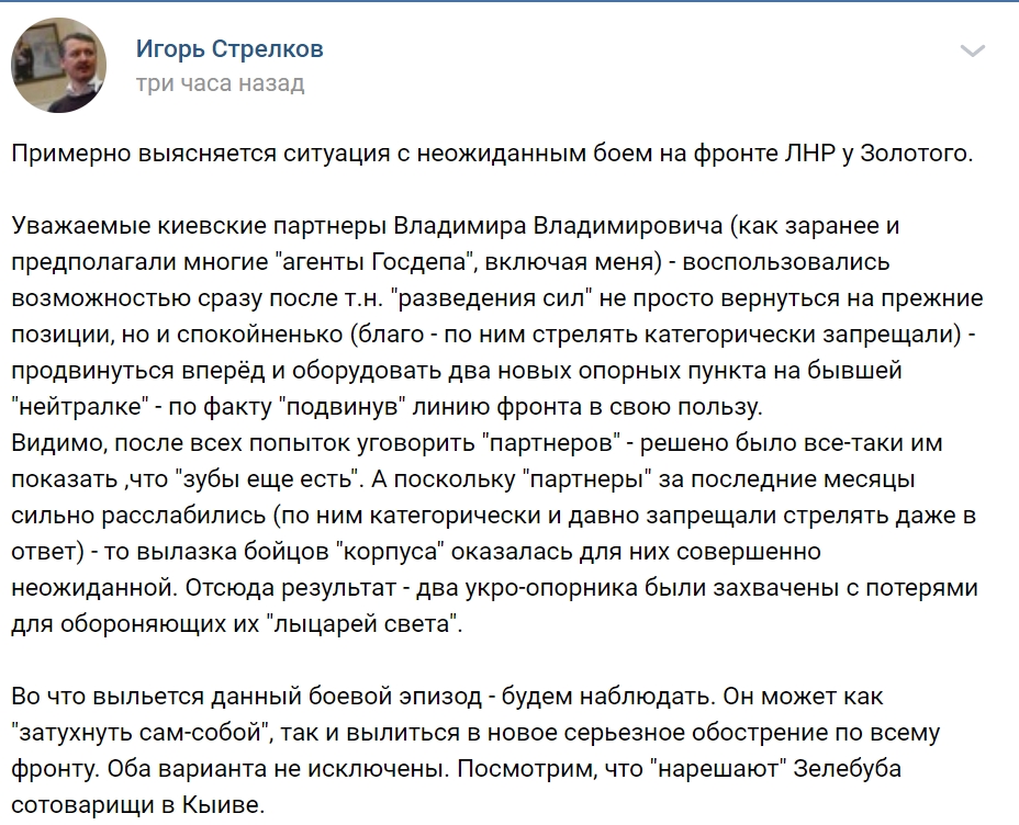 Цитата (12th @ Фев 18 2020, 15:56) контроль местности патрулями и опорными пунктами (с) Капитан Очевидность А вот то что про так называемые ДРГ ЛДНР ты не слышал это потому что эту самую войну патрулей они проебали еще то ли в 16, то ли в 17 году. То-есть несмотря на официально достигнутые при участии международных посредников договоренности о прекращении огня и разведении сторон, ВСУ их умышленно нарушает для "контроля местности патрулями и опорными пунктами" Спасибо , теперь все ясно. -------------------- Красный цвет - цвет администрации. © Pampa