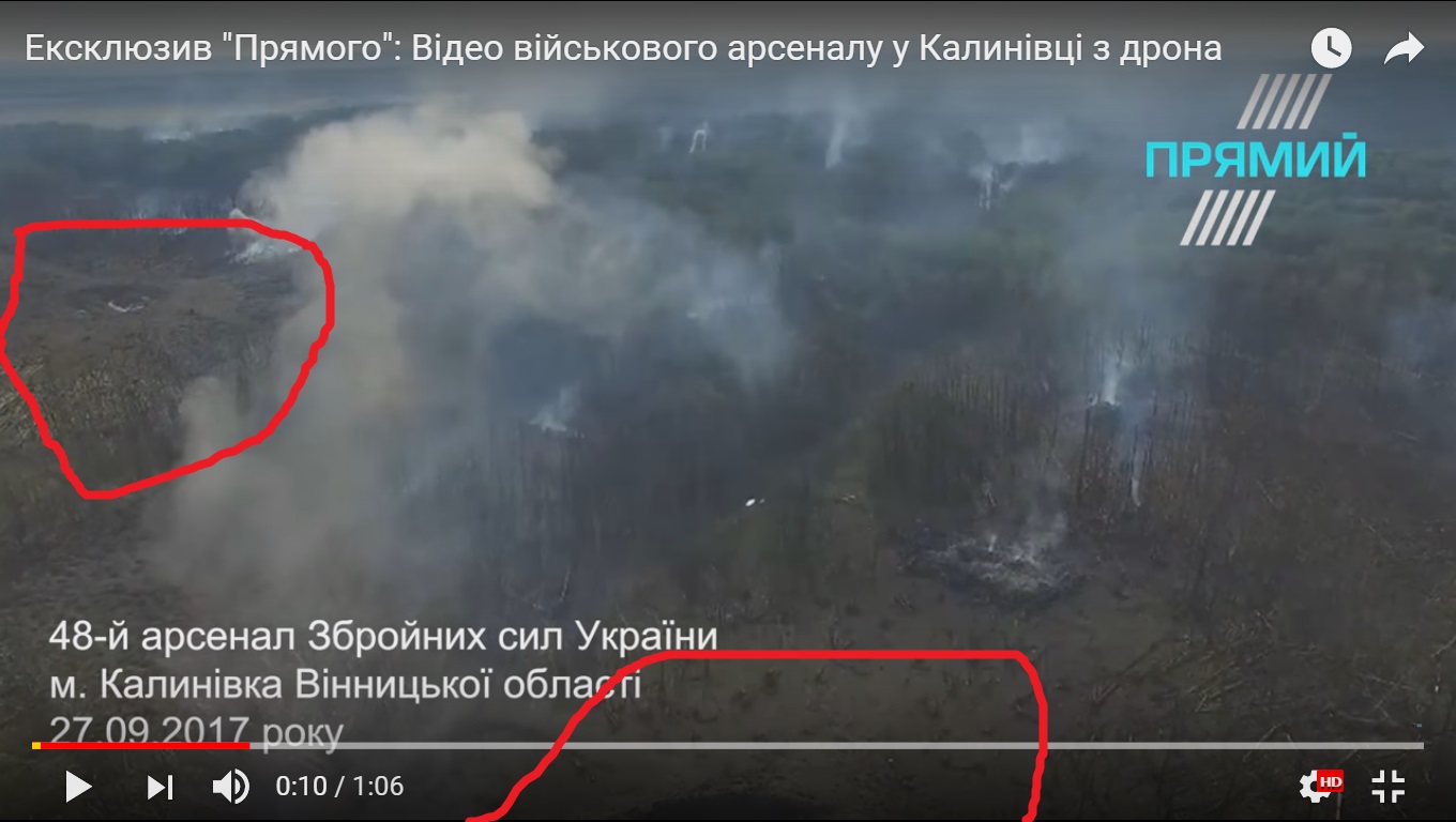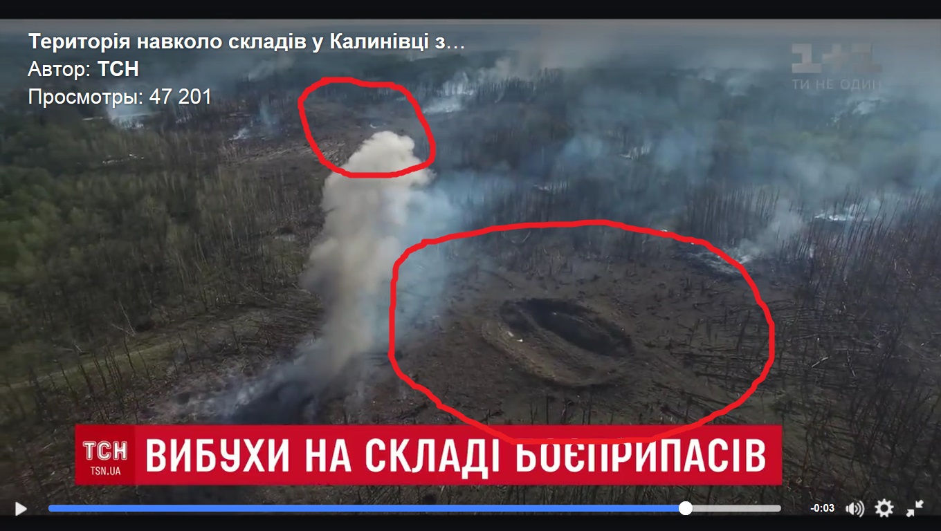 Ютуб-видео как раз начинается над местом взрыва, которое в ФБ-видео является центральным (я и отметил, что "с 0-06 снизу"). То что в Ютуб-видео идет с 0-35 как основное (и в начале тоже мелькает) в репортаже на ФБ-видео тоже есть - выше основного по видео. Т.е. в обоих видео есть воронки от двух больших взрывов со схожим залеганием деревьев. Нажмите для увеличения |