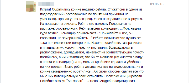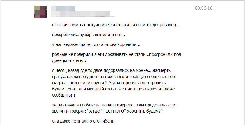 http://polynkov.livejournal.com/1348716.html вся переписка "прекрасна" понятно что "прикопайте где-нибудь" - это все же перебор определенный, но общее отношение к организации учета и освещения вполне отражает: Цитата polynkov 10 июня 2016, не боец. бойцы. я не верил в то, что настолько массово аналогичные постинги были и у других "предателей царя и отечества" - не агентов СБУ и не укр-прпоаганда "цензора",а сами бывшие - доборовльцы-волонтеры-ополченцы и пишут такое. а вот еще - барышня, жена росийского добровльца ( не ихатмнета фомралных вс рф,не вагнеровца и н екадыровца) ,москвича по фамилии,Сидоров -что попал в плен (правда по глупому и по пьяне,но все же) - жалуется в атмосферу на ютубе -уволили задним числом https://youtu.be/WHe_MV1022U?t=211 эти вот "народные милиционеры" - это солдаты даже 2-го, а 3-го сорта. Отношение к ним- что здесь на форуме у ура-патриотов, что у ихнимх конмадиров-Тамбовых , после того как "моджиковский" (в смысле - мотивационно-оирентированный) характер НОД улетучился еще в 2014\15 - как к расходному материалу, какой то серой окопной скотинке, есть - нормально, пусть исполняют задачи , поменьше пьют и не выебываются ... убили? насрать и закопать -уволился еще в декабре Нажмите для увеличения -------------------- Murem za polskim mundurem
