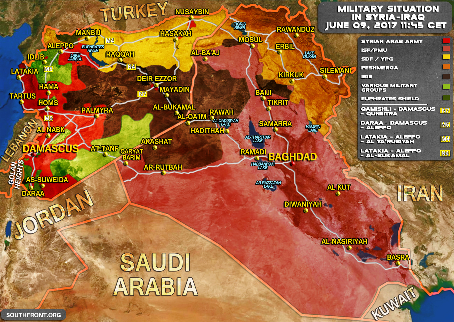 Цитата (slab105 @ Июн 9 2017, 19:03) А вы прямо типа узнали по кому именно там чем то поливают? Геолокация где? Сам же писал,что артой,а не ВВС. А геолокацию сделай/ найди сам.....Гугль в помосч Общий взгляд на военную ситуацию в Battlespace Сирии в Ираке 9 июня 2017. https://southfront.org/military-situation-i...017-map-update/ Нажмите для увеличения -------------------- ЖИВУ БЕДНО, ВИНО ПЬЮ СТАРОЕ, СЫР ЕМ С ПЛЕСЕНЬЮ, И МАШИНА БЕЗ КРЫШИ.