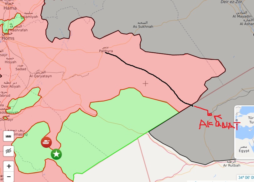 Там нет шоссе, подобно тому, которое идет через Танф. А дороги там есть. Как раз где лоялы вышли к границе, наебав американцев. Дорога из Пальмиры на Акашат в Ираке.