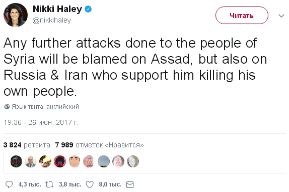 Посол США в ООН Никки Хейли в своем Facebook написала: "Вина за любые последующие атаки на народ Сирии будут возложены на Асада, а также на Россию и Иран, которые поддерживают его в убийствах своего народа" Присоединённые изображения ![]() -------------------- ЖИВУ БЕДНО, ВИНО ПЬЮ СТАРОЕ, СЫР ЕМ С ПЛЕСЕНЬЮ, И МАШИНА БЕЗ КРЫШИ.