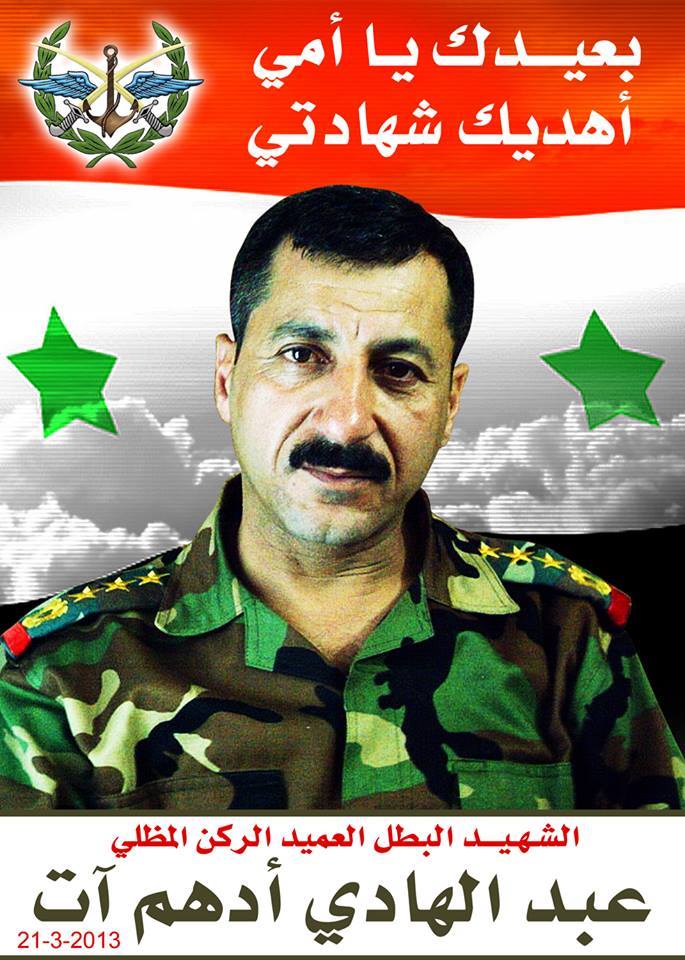 Родился в 1966 году в Баниасе. Родители (или только мать) - выходцы из турецкой Антакьи (Антиохии). Погиб 21.03.2013 в боях в Кунейтре. Посмертно произведён в бригадные генералы. https://www.facebook.com/nusoor.shuhdaasyri...?type=3&theater https://www.facebook.com/banias.world998/ph...?type=3&theater Ему посвящена фэйсбук-страница: https://www.facebook.com/Abd.Alhadi.Aat/ Фахед, скажи, правильно ли переведено его имя и переведи пожалуйста эту заметку с его краткой биографией https://www.facebook.com/Abd.Alhadi.Aat/pho...?type=3&theater Нажмите для увеличения |