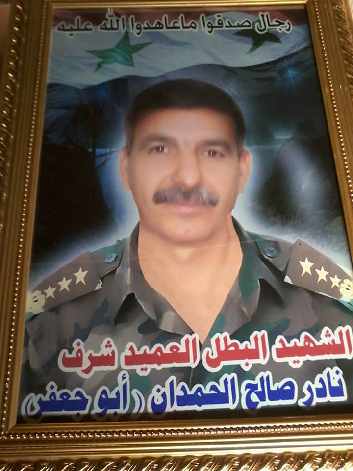 Погиб 16.04.2017 в боях на западе Алеппо. Посмертное звание бригадный генерал. https://www.facebook.com/watan.shdaa/photos...?type=3&theater https://www.facebook.com/Syrian.Martyrs4/ph...?type=1&theater https://www.facebook.com/Syrian.Martyrs4/ph...?type=1&theater https://www.facebook.com/Syrian.Martyrs4/ph...?type=1&theater https://www.facebook.com/thefirst.safita/ph...?type=1&theater https://www.facebook.com/thefirst.safita/ph...?type=3&theater https://www.facebook.com/227949491154348/ph...?type=1&theater https://www.facebook.com/derrimamali/photos...?type=3&theater https://www.facebook.com/homsalasadalmoaeda...?type=3&theater https://www.facebook.com/Tartous.alraddar/p...?type=3&theater https://www.facebook.com/ya3rob88/photos/a....?type=3&theater Нажмите для увеличения |
