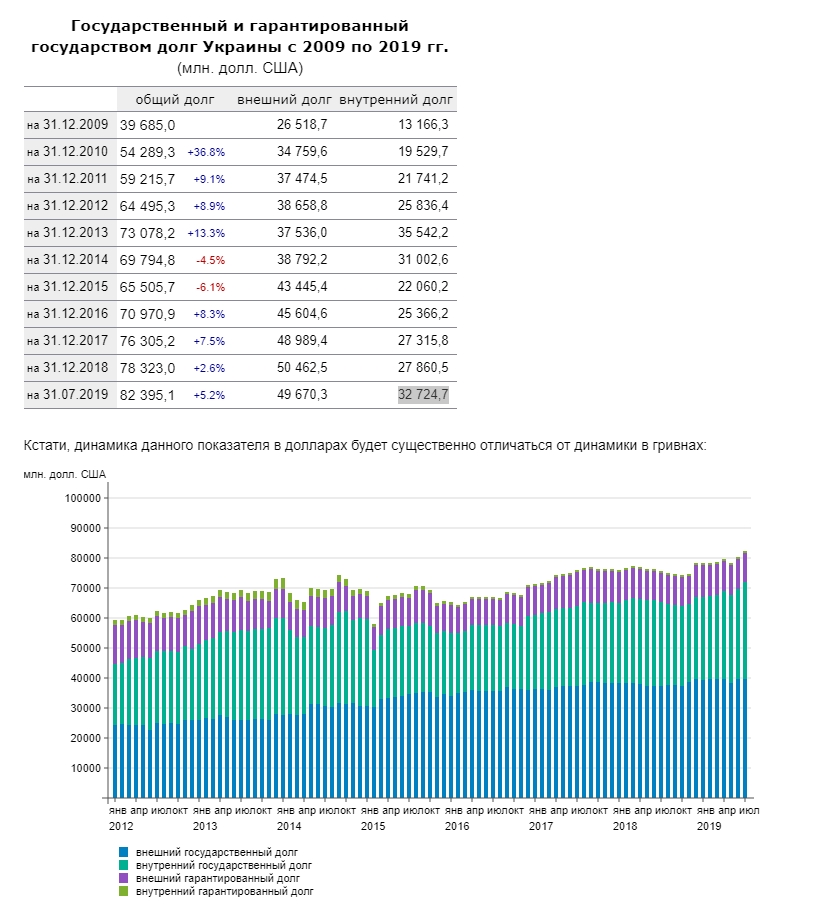 Просто долг немного перераспределился: внешний уменьшился на 1 млрд $ (с 50 462,5 на 1 .01.2019 до 49 670,3 на 1.07.2019), а внутренний увеличился за тот же период на 5 млрд $ (с 27 860,5 до 32 724,7) https://index.minfin.com.ua/finance/debtgov/ -------------------- Ценность любого оружия определяется успешностью его применения и готовностью к использованию в нужном месте и в нужное время.