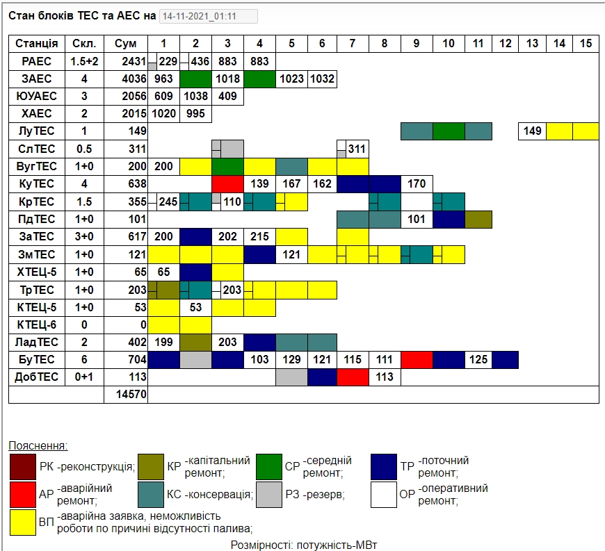 Цитата На государственных ТЭС работают 3 из 23 энергоблоков - "Укрэнерго" По причине нехватки угля не работают рекордные 14 энергоблоков. Еще 6 находятся на разных стадиях ремонта оборудования. Нагрузку несут всего 3 блока из 23 государственных ТЭС, что составляет 10% их мощности. https://www.unian.net/economics/energetics/...a-11608873.html Иначе как саботажем, мне сложно объяснить такую ситуацию. ![]() 14,5 гигават всего. Из них 10,5 - АЭС -------------------- Ценность любого оружия определяется успешностью его применения и готовностью к использованию в нужном месте и в нужное время.
