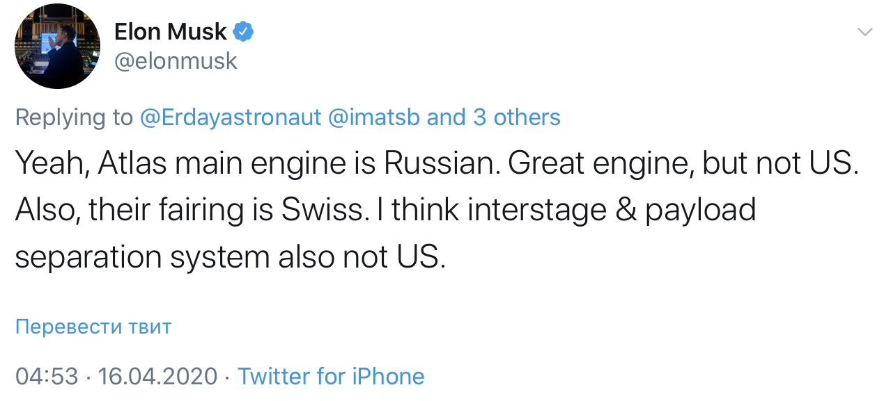 Цитата (0Entry @ Апр 16 2020, 21:25) Первый «Атлас» с РД-180 полетел в 2000 году. А конкурс на двигатель для Атлас-3 проект РД-180 выиграл в 1996 году. Так что - морозные былины, для оправдания нынешней ситуации. Когда пилят-пилят замену и все никак. И вообще в тренде злой Питун, Америка Грейт Эгейн, а ULA до сих пор (уже 20 лет) летает на каких-то русских движках. UPD: оправдываться он полез видимо после этого твита Маска. |