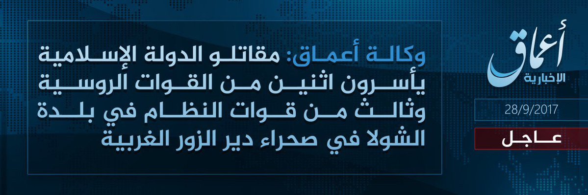 Цитата (atalex @ Сегодня, 14:38) Чо там Амак за двух пленных русских в районе ДэЗа говорит? пока только это Think this is a first. Amaq claiming IS captured two Russian soldiers in an attack near #Deirezzor Нажмите для увеличения -------------------- Мнение — это как дыра в заднице — есть у всех. Но «есть у всех» не означает «надо всем показывать»