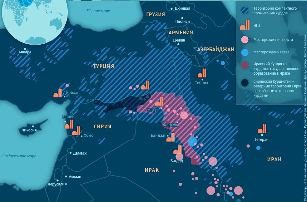 Цитата (Madiev @ Сен 29 2017, 22:48) Карта вообще сильно приблизительная. Например, по карте курды якобы проживают в Нагорном Карабахе... Сильно - это ты еще мягко сказал. Курдистан аж до Багдада и южнее - это пиздец К тому же ssvblr путает Иракский Курдистан и Рожаву (как будто это одно целое) - месторождения в Рожаве и Сирии скромные, но позволяют полностью покрыть потребности не то что Рожавы, а всей Сирии - и даже организовать небольшой экспорт при возможности. -------------------- Такие как ты исподтишка тролят патриота © Madiev.