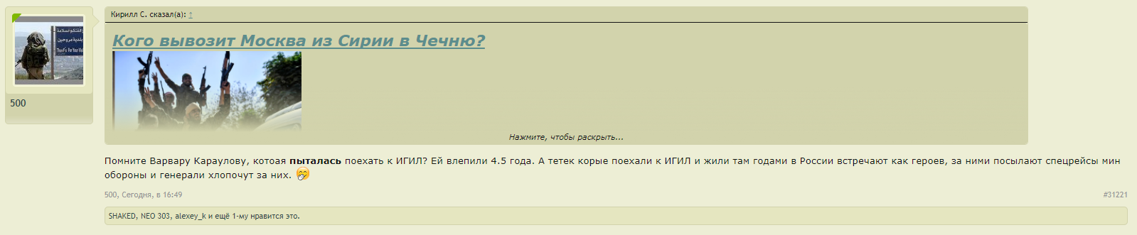 Цитата (Pampa @ Ноя 12 2017, 20:55) Кек. И в самом деле никакой проблемы создать мотивированную, и даже навероное самую мотивированную пехоту и вдобавок создать смертников как обычное расходное оружие. Причем сотни таких расходников в месяц. Но экспертi с дивана подсказывают ничо сложного. З.Ы. И кстати неплохо бы и пруфы на то как цру создает\создавало игил. Учитывая, что ЦРУ помогло захватить власть партии Баас в сове время, то получается да - опосредованно участвовало в создании ИГ -------------------- Такие как ты исподтишка тролят патриота © Madiev.
