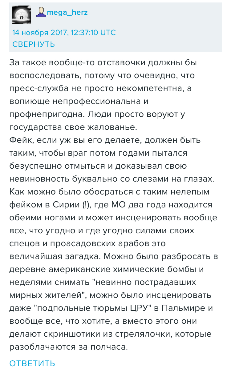 Цитата (12th @ Ноя 15 2017, 17:28) Я вот все думаю как произошла эта досадная ошибка. Вот эти гражданские сотрудники морфа, они информацию о подвигах космонавтов в гугле ищут для релизов? Или им разведчики сверхсекретные флешки с фотками и видосами приносят, а у них чисто случайно на рабочем столе оказываются скрины и видео из интернета и они все время их путают? Я уже писал об этом, у нас считается что младший персонал (как и боец) может всё. Только если раньше доставали из ниоткуда доски, цемент, лопаты и краску, то теперь считается что возможности подчинённых выросли и они способны доставать целые здания и разведданные из Сирии. -------------------- При подлёте топоров, у российской ПВО резко сжимается