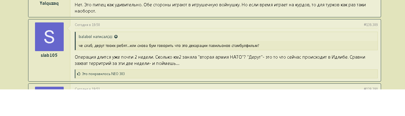 Цитата (Мизантроп @ Фев 1 2018, 22:33) Да ничего не поменялось. Во-первых и прежде всего Слаб всегда топил за выпил бабахов и джихадистов не важно кто их выпиливает, во-вторых во время и по окончании Щита Евфрата давал весьма нелестную оценку турецким военам. Ну и курдам он всегда симпатизировал (не по причине особой к ним любви, а по причине того, что они светские и против всяких "умеренных" и не очень исламистов). Так что все норм, Слаб взгляды не меняет и в прыжке не переобувается. -------------------- Такие как ты исподтишка тролят патриота © Madiev.