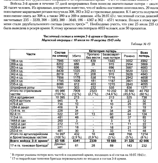 июль-август 1943 сервенее Орла (основное направление усилий 3 А и 63 А,и вроде Горбатво не ткаой уже и мясник-генерал) ударная группа 3 А горматова на пермо эатпе 3ТА (двух корупсного состава -т.е. 8.8 тыс на две дивизии,если по нормальному -корпусы были бригадного состава.Третий корпус 7гв мк/2мк/ переброшен как раз в о вторйо половине июля к фрону из СтепВО) 3А на развити насутпления,в настоивых попытках переломить переброшеныне сюда немецкие подкерпления (танковые и панцеягерские дивизии) Разблюдовка по видам частей и соединений У Крвиоеева указано что стрелковые войска теряли 70-80% от общего числа,во второй эатп войны - но следует отметить что во-1, ситуации были разные во-2, тут только 3А (а у Кривоешина посчитаны и флот и авиация, механизированные обьединения,которые в 3А не быи включены были, и тыловые войск и смертность вгсопиатлях где вид войск трудно уже вывить в таких числах) 97% потерь -стелковые дивизии. Следует ометтиь что ,когда бои были без окружений , в самой дивизии так же подавляющее большинство прихоидлось на стрековую цепь, пуеметчиков, расчеты прямой наводки (ПТР и ПТпушки сопровждения,если такое были) - доходя до 85-90-95% В квалерийских и механизированных и такновых частях сходная категория (цепь спешенных кавсэадроном,пулметные эскадроын и роыт,рота автоматчиков едсанта и мсб, пушки прямой навокди) - так же давали большюу категорию. У танкиство в такой же гурппе "риска" были и сами танковые экипажи. (у немецев как указано на примре выше -в танковой дивизии 2\3 пришлось на пехоту -т.к. других видов вйоск больше и они сильнее были вовелчены в боях на переденм крае) Передовая цепь за месяц промывалась кроваоым потоком по 2 и более состава (причем что обидно за время оперативной паузы -войска смогли подучиться,склотится... но и немцы не теряли времени а выучка и сонащение бронетакновых вйоск у них всегда была на высоте.чтобы вот так вот продавить живой массой наудалую...но продавили....) Не хуже чем Ржев-42 какой нибудь... Нажмите для увеличения Присоединённые изображения -------------------- Murem za polskim mundurem