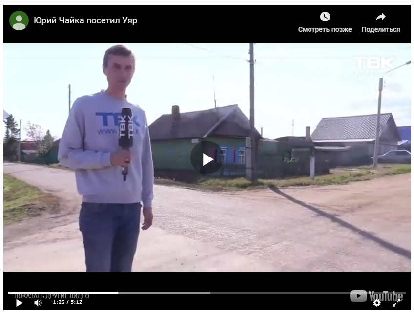 Перед визитом генпрокурора в Уяре отремонтировали дороги в центре, обновили разметку, установили новое уличное освещение. Власти привели в порядок территорию вокруг районной прокуратуры, сделали новые пешеходные дорожки. Правда, они заканчиваются в паре метров от входа. Но самое главное — за бюджетные деньги уложили асфальт ровно до дома одноклассницы, хотя ранее его никогда не было. Дальше Чайка не поехал, и дороги там не отремонтировали. Все это было сделано за пару недель. http://m.rosbalt.ru/russia/2019/09/30/1805138.html -------------------- Такие как ты исподтишка тролят патриота © Madiev.