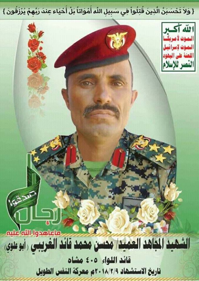 Воюет на стороне хуситов. Начальник штаба 6-го военного округа. 22.05.2016 посещает позиции 72-й и 122-й бригад в провинции Саада. https://sabanews.net/ar/news428664.htm http://www.almshhadalyemeni.net/2772/ https://www.alhagigah.net/?p=16441 15.10.2016 на совещании у хуситского президента Салех ас-Самада. https://www.alhagigah.net/?p=28523 https://www.yamanyoon.com/?p=49807 https://www.facebook.com/shfinews/photos/p....?type=1&theater 15.02.2017 на совещании в Сане у начальника генерального штаба генерал-майора Мухаммед Абд ал-Карим ал-Гамари. https://www.26sep.net/news_details.php?lng=arabic&sid=125397 1.12.2017 вошёл в состав какого-то военного комитета. http://www.yemenmonitor.com/Manage/Archive...ArticleID/21762 https://www.facebook.com/shfinews/posts/1722472344449681 1.03.2018 на заседании в генеральном штабе. http://yemen-tv.net/index.php?mod=contents...&cid=4&id=10875 |