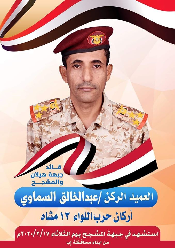 Родился в 1976 году в провинции Ибб. С 1994 года на службе в йеменской армии. В 1998 году окончил училище ПВО (15-й курс). К 2013 году служил в 1-й горной бригаде. В текущей гражданской войне воевал на стороне А. Хади. С 2015 года в штабе 143-й бригады. В 2018 году назначен заместителем начальника оперативного отдела штаба 143-й бригады. В 2019 году назначен начальником штаба 13-й бригады 3-го военного округа. Погиб 17.03.2020 в боях в провинции Маариб. http://maeenpress.net/newscongrats/15036/ http://yemenvibe.com/urgent-news/%D8%AA%D8...9%88%D9%8A.html https://www.facebook.com/photo.php?fbid=927...&type=3&theater https://www.alkhabaralyemeni.net/2020/03/18/81964/ Соболезнования от Али Мохсен ал-Ахмара. http://khlaasa.net/481856 Видео с ним. https://www.facebook.com/105905157598670/vi...29926465056168/ Его похороны. https://www.youtube.com/watch?v=fbOryFf9vak Нажмите для увеличения |