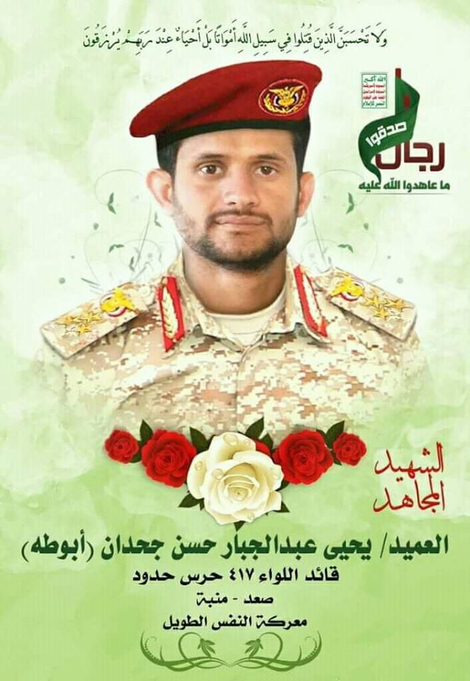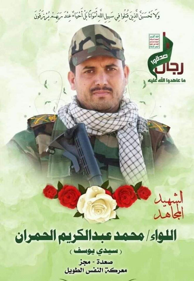 Воевал на стороне хуситов. Командир 417-й бригады пограничных войск. Погиб 8.02.2020 в боях. https://www.ansarollah.com/archives/315193 https://sahafah-24.net/news/197528 https://www.yemenpress.org/ar/%D8%A7%D9%84%...B3%D8%AA%D8%B4/ https://ahdathnet.net/news4301.html https://www.facebook.com/photo.php?fbid=503...&type=3&theater Видео его похорон. https://www.youtube.com/watch?v=BgkqvogJ_nA Нажмите для увеличения |